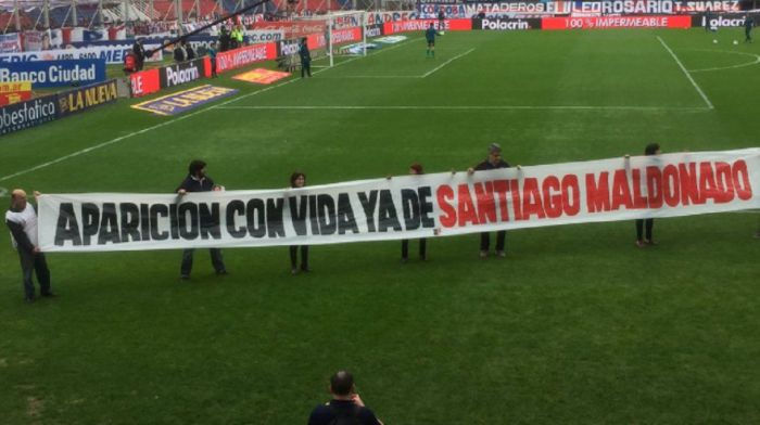 El reclamo por la aparición con vida de Santiago Maldonado, el joven desaparecido desde el 1° de agosto, detenido durante la represión de una protesta Mapuche de Cushamen, ubicado en la provincia argentina de Chubut, se trasladó al fútbol profesional de Argentina, donde futbolistas, clubes e hinchas pidieron por la aparición con vida de Santiago. En el estadio Nuevo Gasómetro, en la previa del partido entre San Lorenzo y Racing, una pancarta fue exhibida con la leyenda: “Aparición con vida YA de Santiago Maldonado”, a cargo de los integrantes de la Comisión de Derechos Humanos de San Lorenzo y miembros de una ONG. La Asociación del Fútbol Argentino (AFA), no le permitió al plantel del club San Lorenzo posar con la pancarta como había pedido formalmente el presidente de ese club. Es importante destacar que el actual presidente del organismo que rige el fútbol de la vecina orilla es Claudio Tapia. ¿Quién es Claudio Tapia? Este dirigente tuvo como su primer trabajo en la vida, el de barrendero, en la ciudad de Buenos Aires. Fue empleado de Manliba (una empresa del Grupo Macri). Tapia decidió afiliarse al sindicato de Camioneros. En la actividad sindical conoció a Paola, su actual esposa, quien es una de los cinco hijos de Hugo Moyano, el poderoso líder del gremio. Tapia llegó a la presidencia de AFA luego de contar con un gran apoyo del actual presidente de Argentina y ex presidente del club Boca Juniors, Mauricio Macri. Otro club que mostró su solidaridad con la lucha por la aparición con vida de Santiago Maldonado fue Temperley, cuyos futbolistas rompieron las barreras y mostraron una pancarta con el rostro de Santiago, antes de su partido frente a River. Los hinchas del club Banfield por su parte mostraron su mensaje solidario al colgar una bandera en el alambrado del partido de su equipo frente a Belgrano, que decía: “Aparición con vida de Santiago Maldonado”. A nivel de los deportistas, el golero de la selección argentina de fútbol, Nahuel Guzmán, también se sumó al reclamo por la aparición con vida de Santiago Maldonado. Eligió hacerlo colocándose una camiseta negra con la leyenda: “Dónde está Santiago?”. El mensaje llegó en vivo a todo el país frente a las cámaras de televisión cuando el futbolista arribaba al aeropuerto de Ezeiza para sumarse a su selección que venía a disputar el encuentro con los celestes por las eliminatorias en el estadio Centenario. Diego Maradona también se sumó a la campaña. Escribió en las redes sociales: “Un día más y sigue sin aparecer Santiago Maldonado. Todos los argentinos te esperamos!!!”