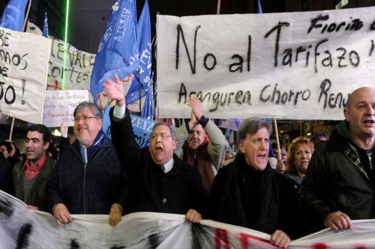 Las protestas y los paros ya se han convertido en un reclamo habitual en este país, donde hay vasos comunicantes entre muchos de los gremios sindicales y distintos sectores: el alza constante de precios en los servicios básicos, el reclamo latente por mejores salarios y los despidos. Los trabajadores del subte o metro porteño, que desde la semana anterior realizan medidas de fuerzas por la apertura de paritarias, como se le conoce aquí a las negociaciones salariales, volvieron a encabezar una demostración contraria. Al menos, en esta ocasión, interrumpieron el servicio en horas tempranas y no en horarios picos, y en varias ocasiones han facilitado a los pasajeros viajar gratis con la apertura de molinetes, un alivio para quienes hoy cuentan la plata pues el precio del boleto ha subido y al parecer se encamina a otro aumento como sucedió con los colectivos (ómnibus). En la plaza de los dos Congresos las protestas forman parte de la vida cotidiana y desde la semana última cobra una nueva modalidad: regalar los productos como lo hicieron los agricultores con un ‘verdurazo’ y lo hacen hoy los panaderos, que reparten cinco mil kilos de pan en protesta por el incremento en las materias primas. En las calles, donde la protesta social genera un caos de tránsito cada semana, en esta jornada los diversos gremios docentes de la provincia de Buenos Aires salieron a marchar por un conflicto latente que, lejos de resolverse, empeora. Además de parar por 24 horas, los cinco sindicatos que aúna el Frente de Unidad Docente Bonaerense encabezaron una manifestación con varios cortes de calles hasta llegar a la sede de la Casa de la Provincia de Buenos Aires, en la céntrica avenida Callao. ‘Luche, luche, luche y que se escuche’, gritaban hoy los maestros al ritmo de cánticos y el repicar de tambores. Los docentes bonaerenses rechazan por séptima vez la oferta ofrecida por el Gobierno local de aumentar el salario en un 15 por ciento a pagar en tres cuotas, que ellos califican de insuficiente y reclaman al menos un 20 por ciento. Mientras la protesta social se siente en las calles, este miércoles , dentro del Congreso, arrancó la sesión especial pedida por la oposición para debatir el alza de las tarifas, con la presencia de las coaliciones del oficialismo que bajaron al recinto, a diferencia de la semana anterior. Hoy jueves los metrodelegados del subte realizarán otra jornada de lucha y el gremio de los camioneros anunció un paro de 24 horas en las ramas correo y clearing, en defensa de siete mil puestos de trabajo en riesgo en la empresa de correo postal OCA, subrayaron. Con información de Prensa Latila